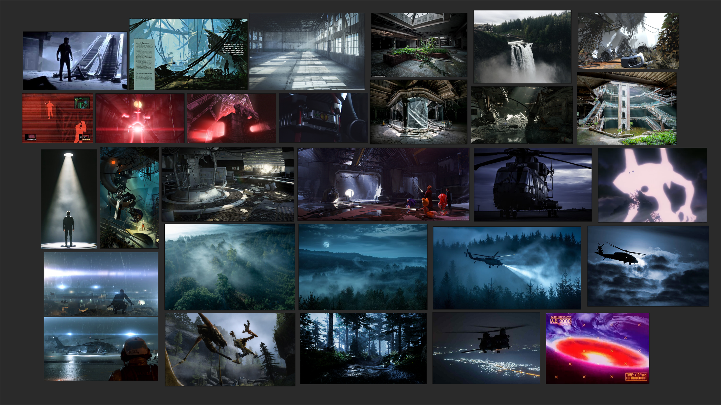 While much of the story takes place in urban environments, I wanted the prologue to capture the unique climate of the Pacific Northwest. Growing up in Western Washington, I was surrounded by both nature and technology. I’ve found creating mood-boards and music playlists an efficient and fun way to explore these ideas.